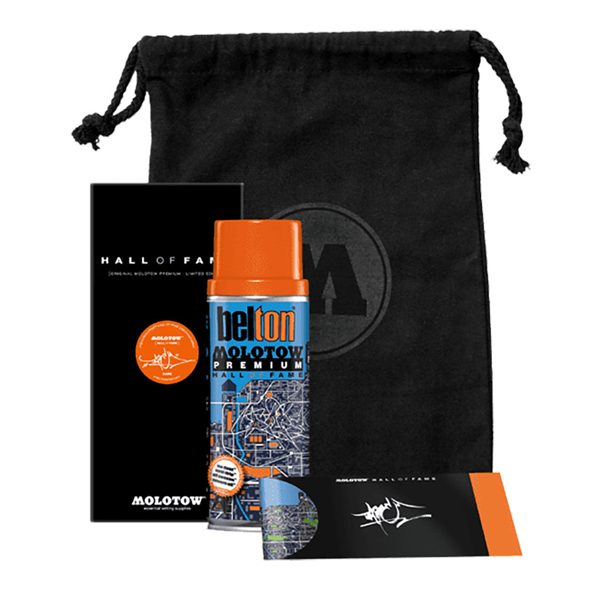 Dette eksklusive sæt er bygget omkring Molotow Premium #014 “DARE Orange,” den signaturfarve, der længe har været forbundet med hans ikoniske værker. Pakken er i en premium samlerør med originalt DARE-kunstværk og toppet med et specialklistermærke med hans tag. Denne udgave føles mere som et monument end et malersæt. Indeni finder du et 24-siders kunstnerhæfte – en visuel rejse gennem DARE’s værker, fyldt med skitser, fotos og sjældne materialer, der fanger essensen af hans bogstavbaserede mesterskab.