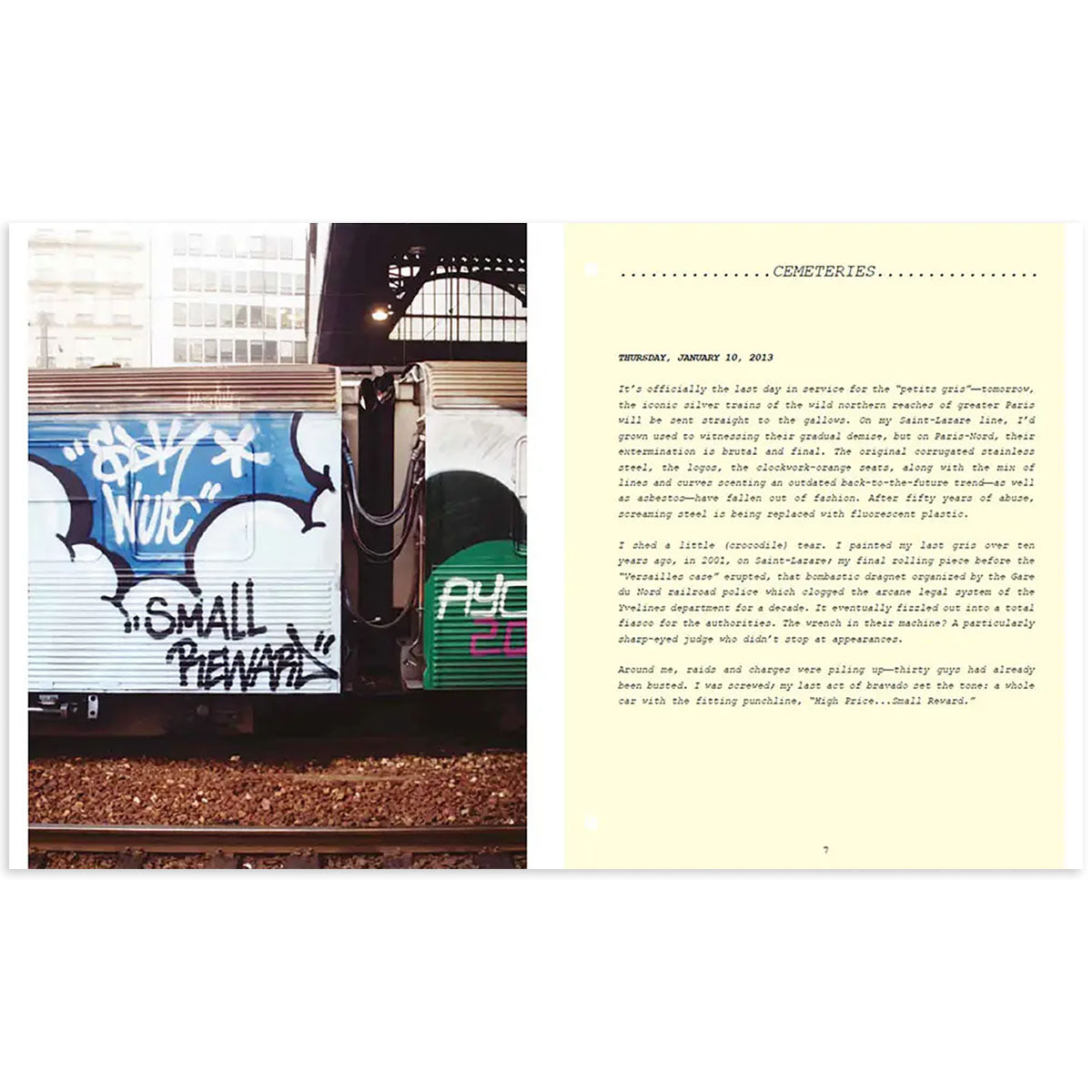 This 302-page linen hardcover follows his five-year journey from 2013-2018, tracking down scrapped Northern Paris trains - the 'petits gris' (little grey ones) - in train yards across France to paint them one last time before they're gone forever. The book mixes archival photos from the 90s when these trains were still running with recent documentation of his farewell pieces. OPAK brought along heavy hitters like ACID79, CHILL, CURE, IDEAL, MILK, PONE, SKEME and more to session these train graveyards.