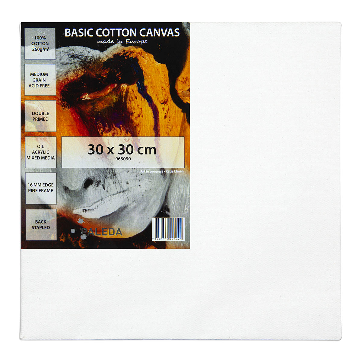 260 gram stretched cotton canvas on a wedge frame of pine wood. The canvas has a medium-rough structure and is double-primed with white paint, perfect for both markers and brushes. Stitched on the back of the frame, which allows you to use the entire canvas, including the sides. Affordable canvas perfect for acrylic, gouache or oil paints. Size: 30 x 30 cm. 1.6 cm thick edges. Made in Europe. View all our canvases and canvas panels.
