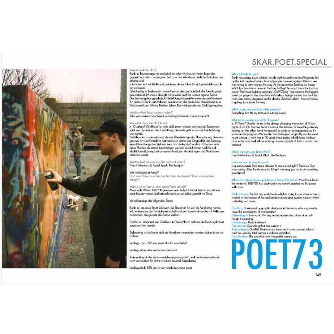 Issue No.1 is out now and gives you insight of Berlin‘s huge graffiti scene on more then then 290 pages. You‘ll get some impressions by Berlins finest Graffiti Writers. Berlin's Famous writers and Crew Names are documented in this mag and tell their stories in interviews. In our custody you’ll find an interview with Poet & Skar as well as specials with Odem, Raws, Kiss81 and more.
