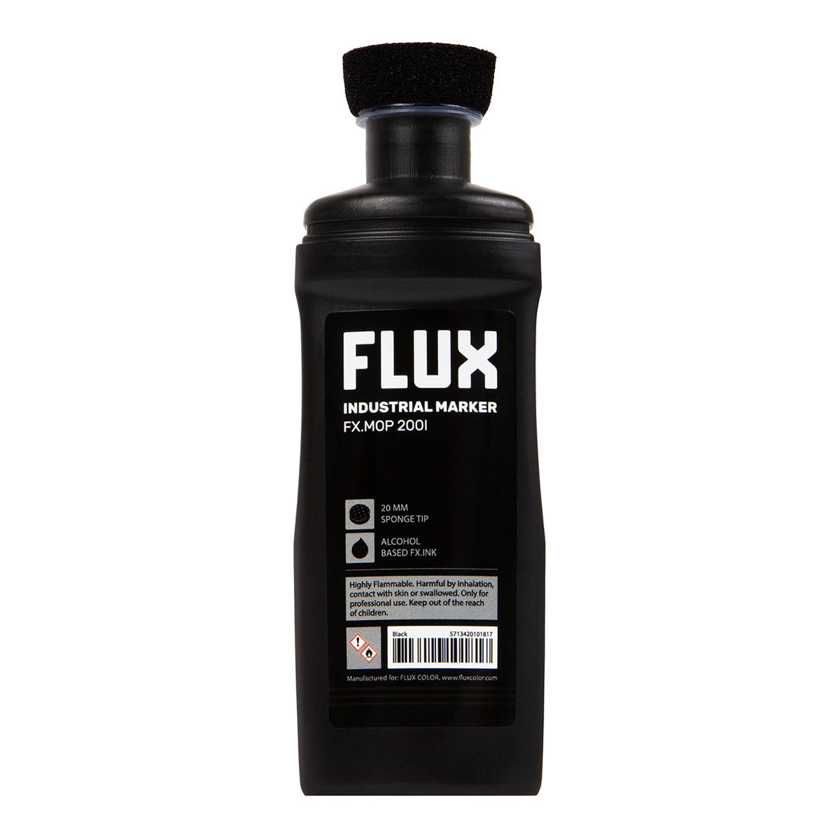 Classic shoe polish mop filled with black FLUX FX.INK. The round tip leaves thick creamy lines, and you can squeeze the body of the marker to get even more ink out. The FLUX-ink is alcohol based, so called “penetrating ink” that absorbs into the surface. The tip is 2 cm in diameter and it is made from foam. Best for use on smoother surfaces. The marker is refillable, and extra tips can be purchased separately.