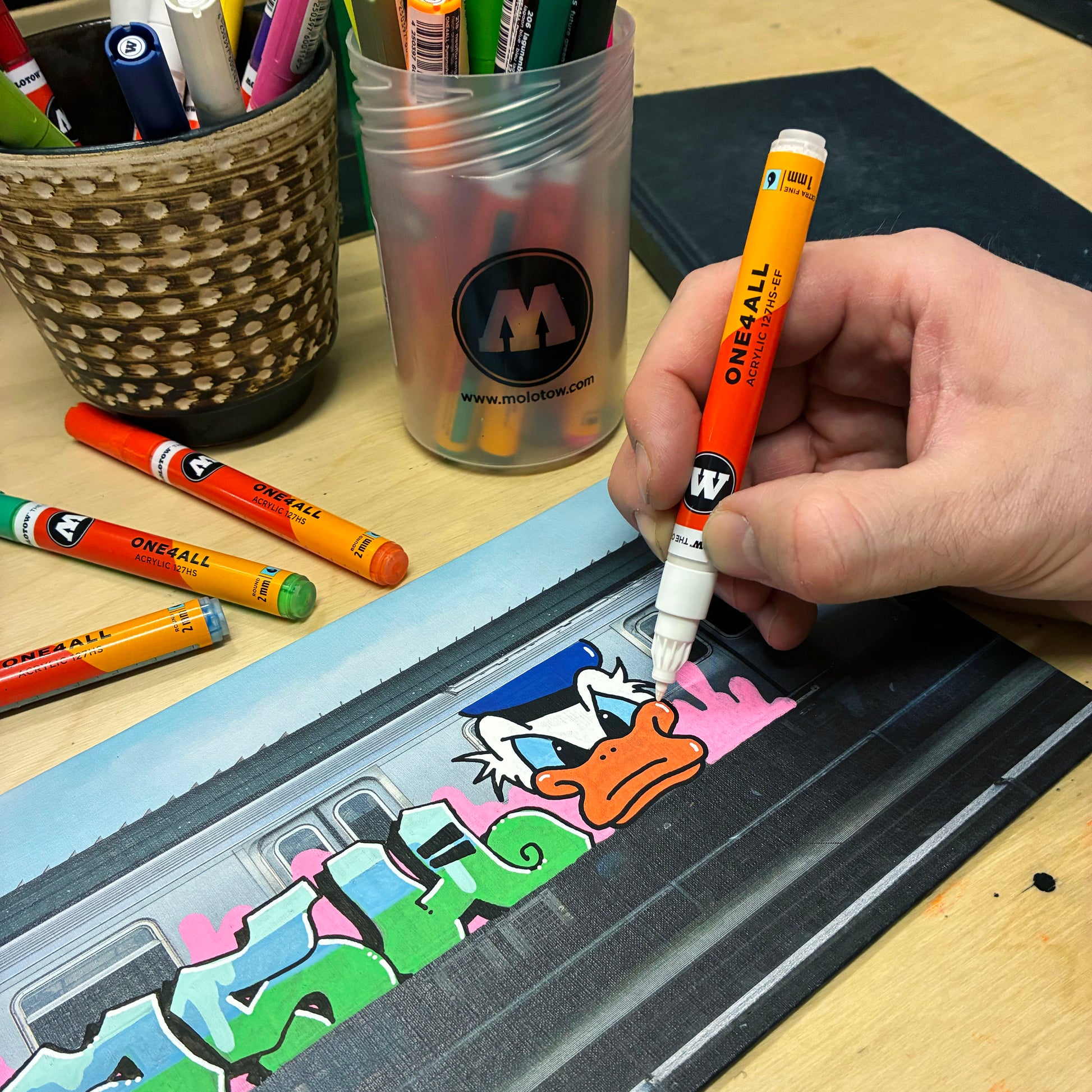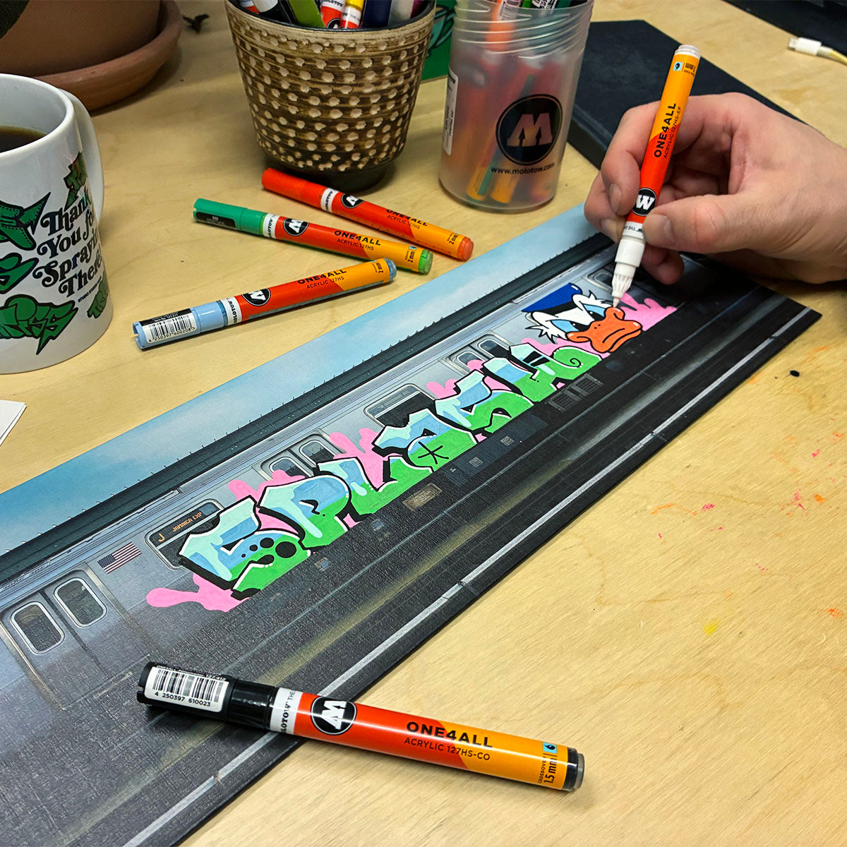 The canvas is made for Molotow ONE4ALL acrylic markers - the paint sits clean on the surface and the colors pop just like they would on a train. Work out your letters, test color combos, or just create something to hang on your wall. Way better than sketching in a blackbook when you want to see how your piece translates to that iconic subway format.