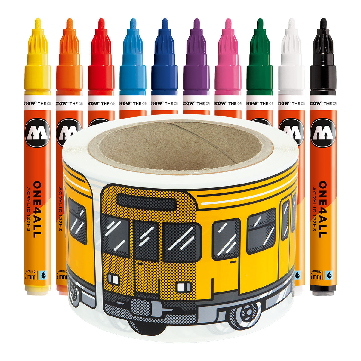 This package includes a Molotow ONE4ALL 127HS 10set Basic 1 and a roll of FLUX System Stickers Berlin Metro 200 pcs.