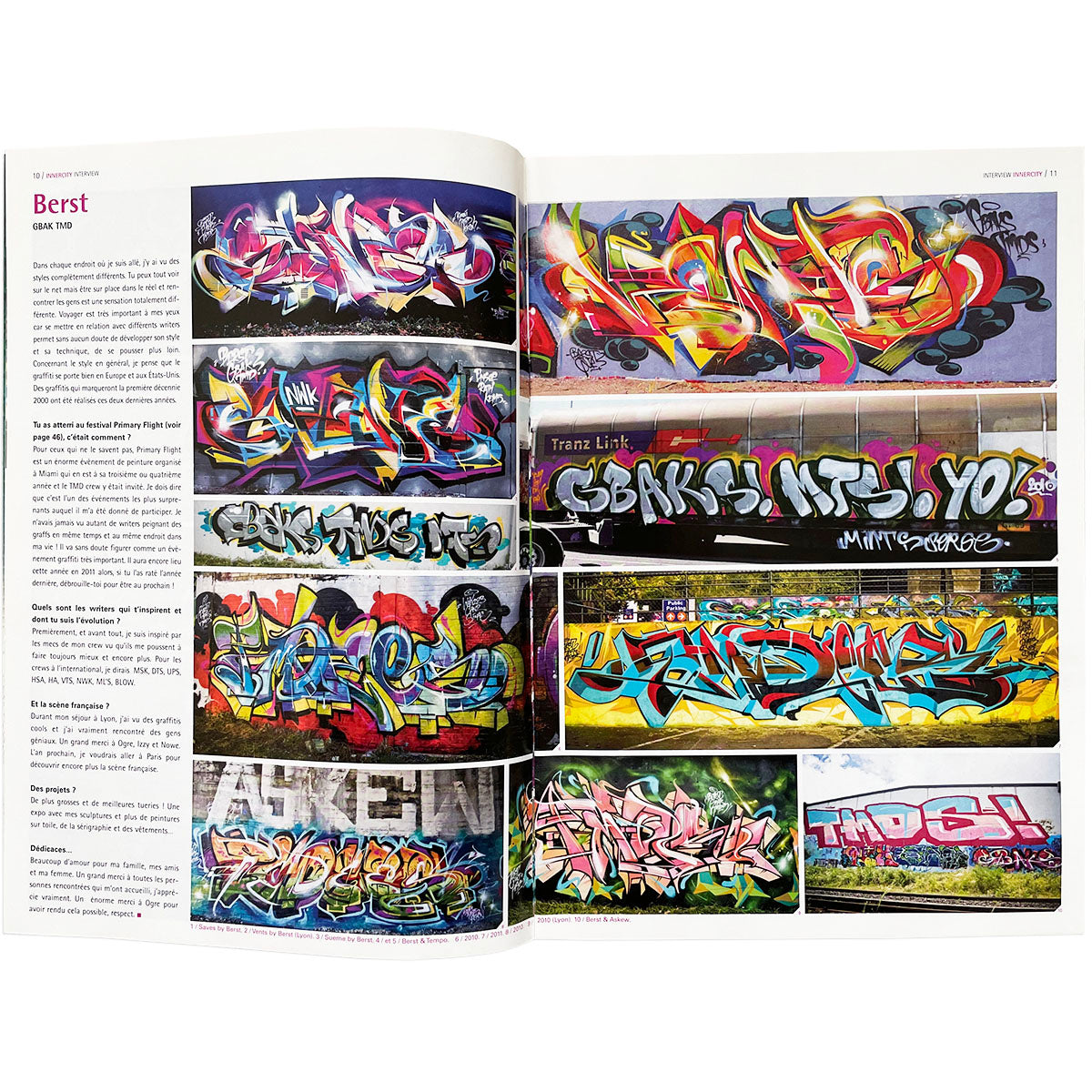 The french magazine Innercity offers a great mix of burners, walls, blackbook drawings and tags. A great magazine for style witers with top quality content and a great mix of quick tags and colorful masterpieces. This issue was released in 2011 and features: Berst (Auckland), Wert (Italy), Onicks (Marseille), Fred & Stereo, Sobekcis (Serbia).