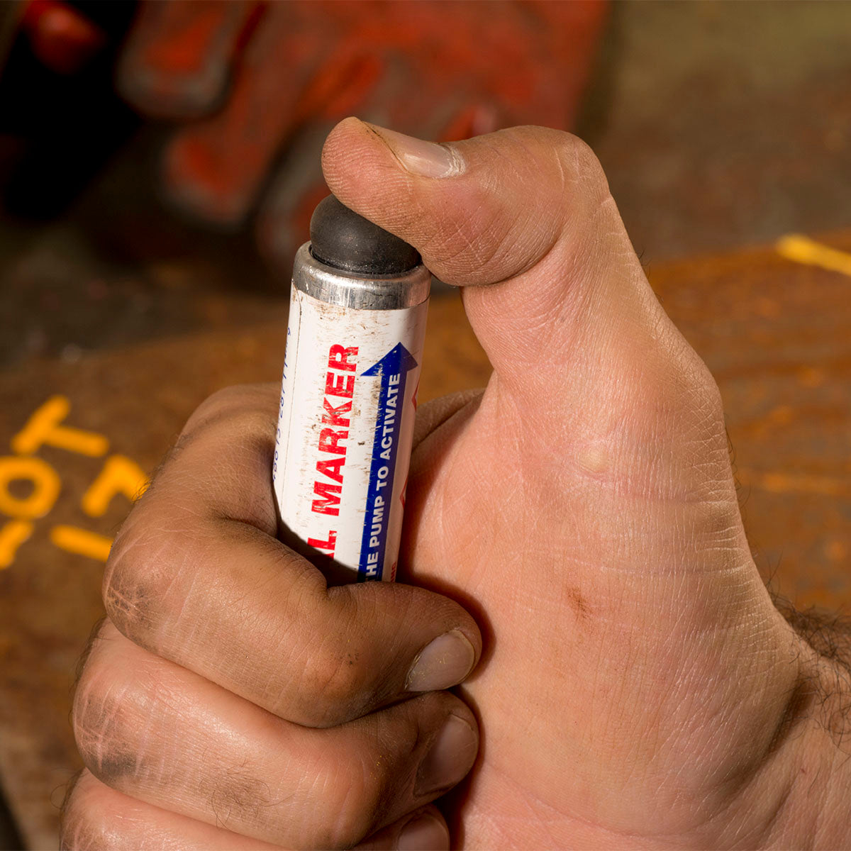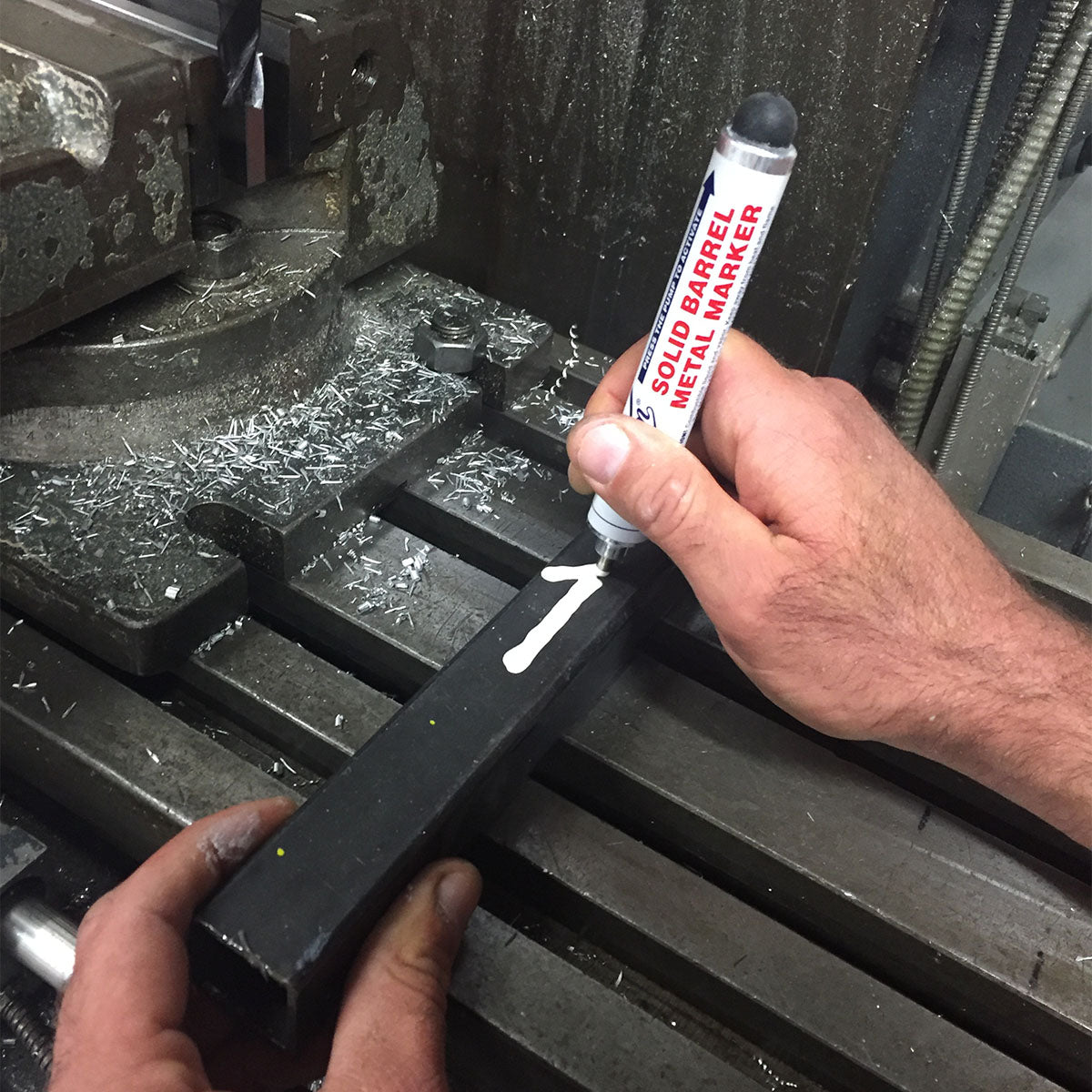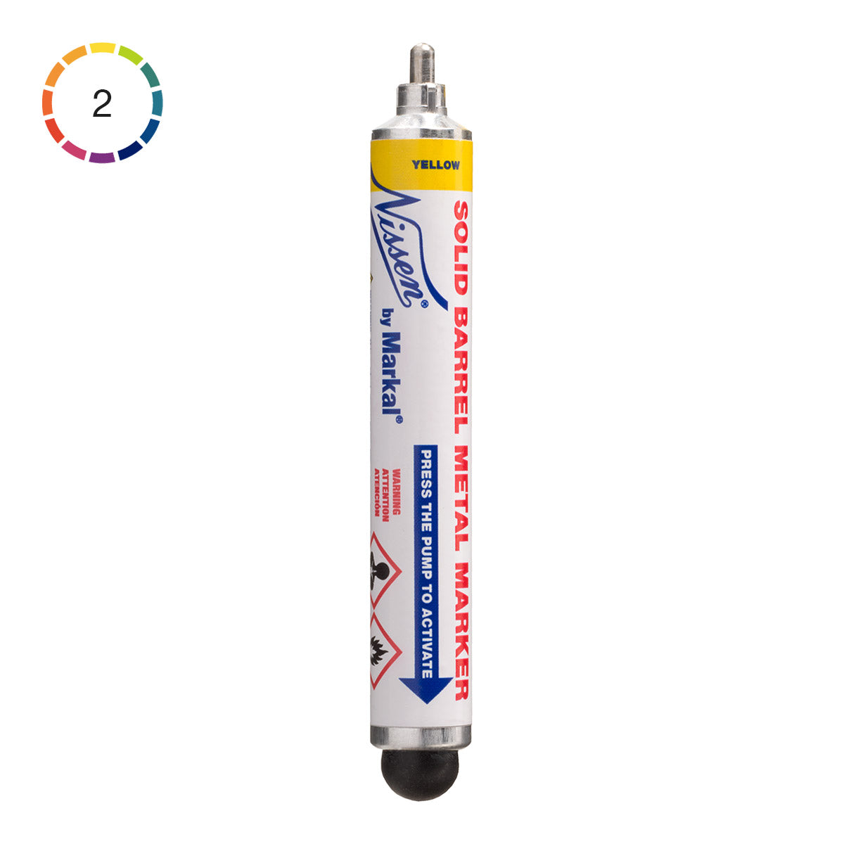 Metal Head industrial marker pen from Markal. The pen is entirely made of metal and has a 3 mm (1/8") metal ball at the tip that can withstand even the toughest surfaces. At the back of the pen, there is a rubber pump so that you can build up pressure in the pen and thus get a perfect flow when writing. Markal Solid Barrel Metal Marker 3mm is filled with glossy enamel paint that adheres to almost all surfaces and can withstand tough weather and sunlight without fading. Made in the USA.