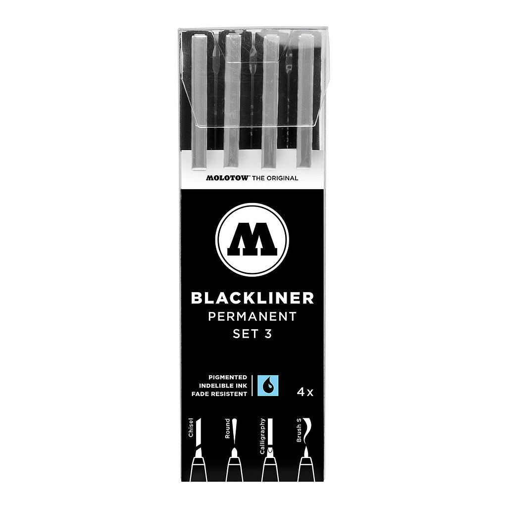 The Molotow's Blackliner pens are filled with black permanent pigment ink and are perfect for drawing outlines and details. The ink is waterproof and is classified as "archival ink" with high lightfastness. Like most of Molotow's products, these are also made in Germany. This set includes pencils in the sizes: chisel, round, calligraphy, brush s-tip. See all markers and products from Molotow here.