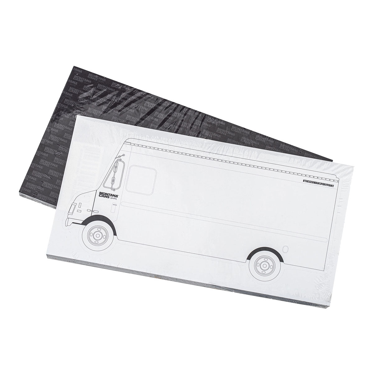 The Montana Delivery Van Stickers 50-Pack features 50 white adhesive stickers shaped like the classic American delivery van. An iconic target for graffiti and street art, these stickers are perfect for collectors, sticker bombers, or fans of painted vans. The dispersion print allows for painting with your favorite markers or paints, letting you create unique designs on each sticker.