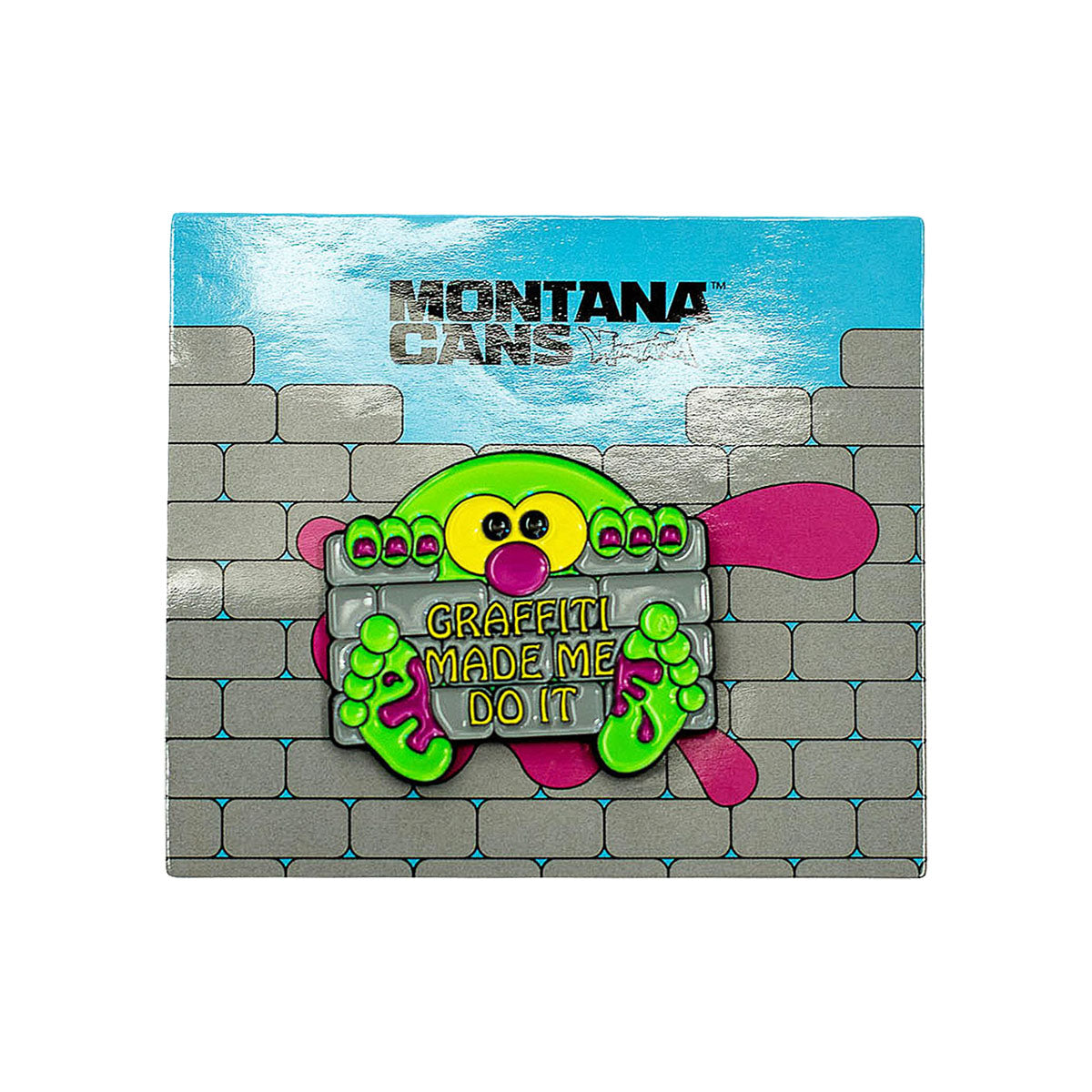 Show your street art attitude with the Montana Cans Graffiti Made Me Do It enamel pin. Designed by Spanish artist FRESH, this soft enamel pin features 5 striking colors and a bold design that makes a statement wherever you wear it. Secured with two back fasteners and mounted on a full-color printed card, it’s perfect for collecting, gifting, or pinning on your favorite gear. Size: 40 × 34.3 mm.