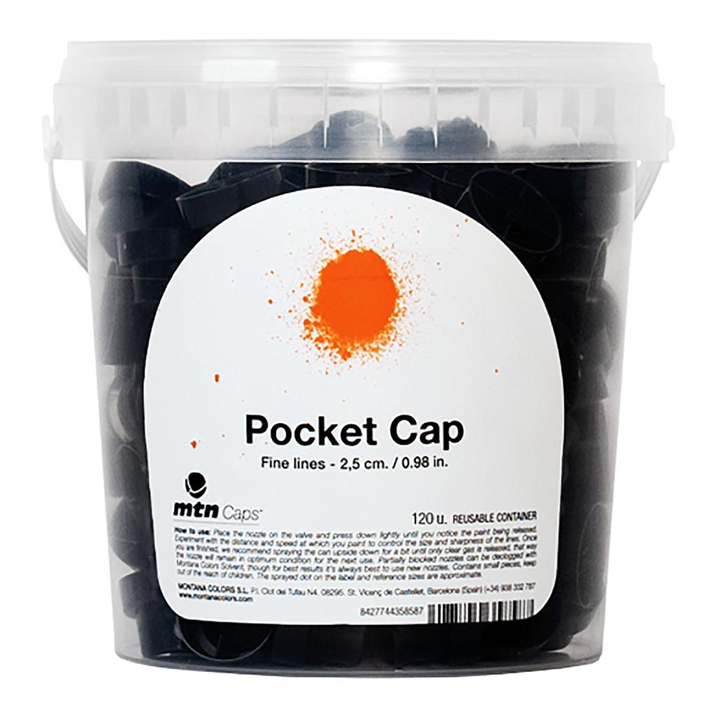 Big pack with 120 MTN Pocket (Original) Fat Caps, delivered in a practical plastic bucket. The MTN Hardcore Caps gives about 1,4 - 2,5 cm wide lines. See our entire range of spray caps here.