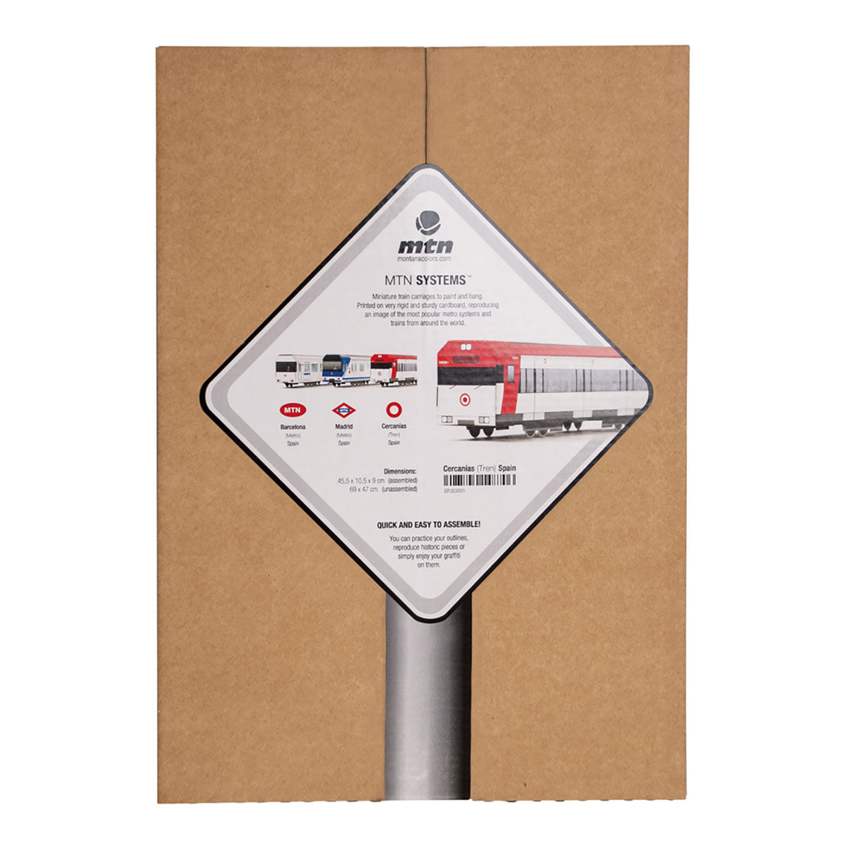 MTN System Cercanias is a miniature model in cardboard that you can paint yourself. Paint a whole car or panel without the risk of getting caught by the police. For best possible results we recommend you use fully covering acrylic pens, which gives the same feeling as with fully covering spray paint. The train will be about 43 cm x 10 cm x 9 cm once it has been folded.