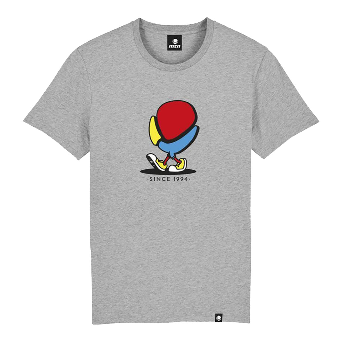 A unisex, ecological and uniquely designed t-shirt that features an illustration of the MTN logo as a cartoon character on the chest. Color: Heather grey 180g certified organic cotton Vegan product approved by PETA.