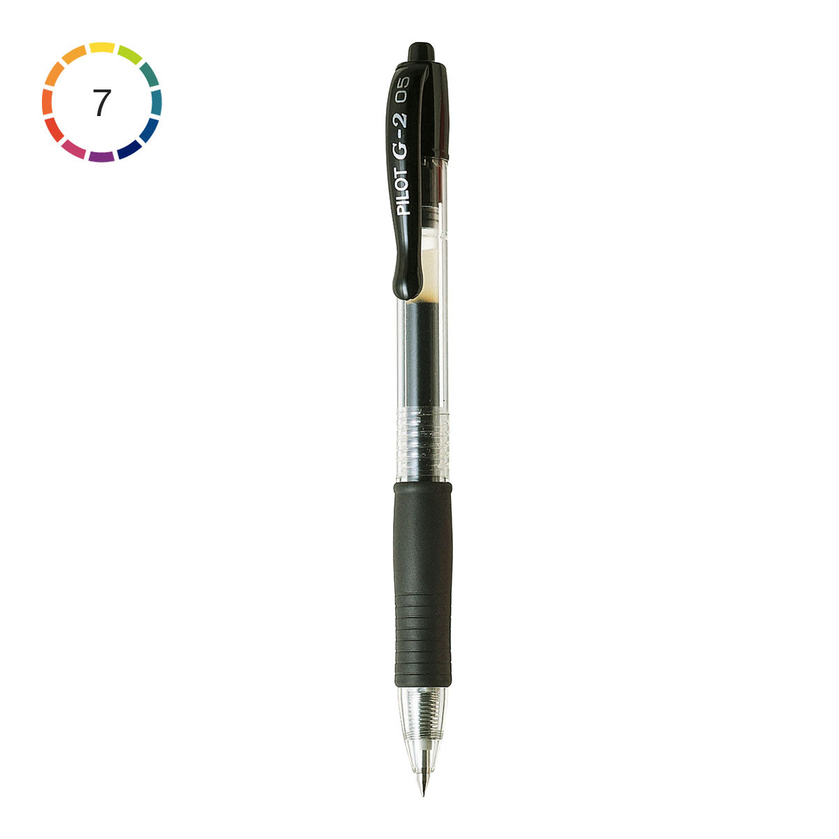 Gel Ink-pens from Pilot with a 0.5 mm Extra Fine tip. The Pen is filled with a Gel ink that flows easily and comes in seven different colors. Refills can be bought for the regular colors: Pilot BLS-G2-5 Gel Ink 0.5 mm Refill. You can also check out the wider variant which comes in even more different colors: Pilot G-2 Gel Rollerball Pen, 0.7 mm.