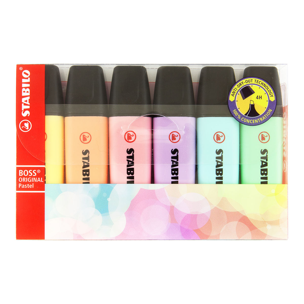 Pack of 6 Stabilo pastel-coloured highlighters. These pens are perfect for mono-coloured sketches and throw-ups. They are also great for marking text in course literature and other books as they have a short drying time. The pack includes the following colours: Pastel Green, Pastel Pink, Pastel Yellow, Pastel Orange, Pastel Purple and Pastel Blue.