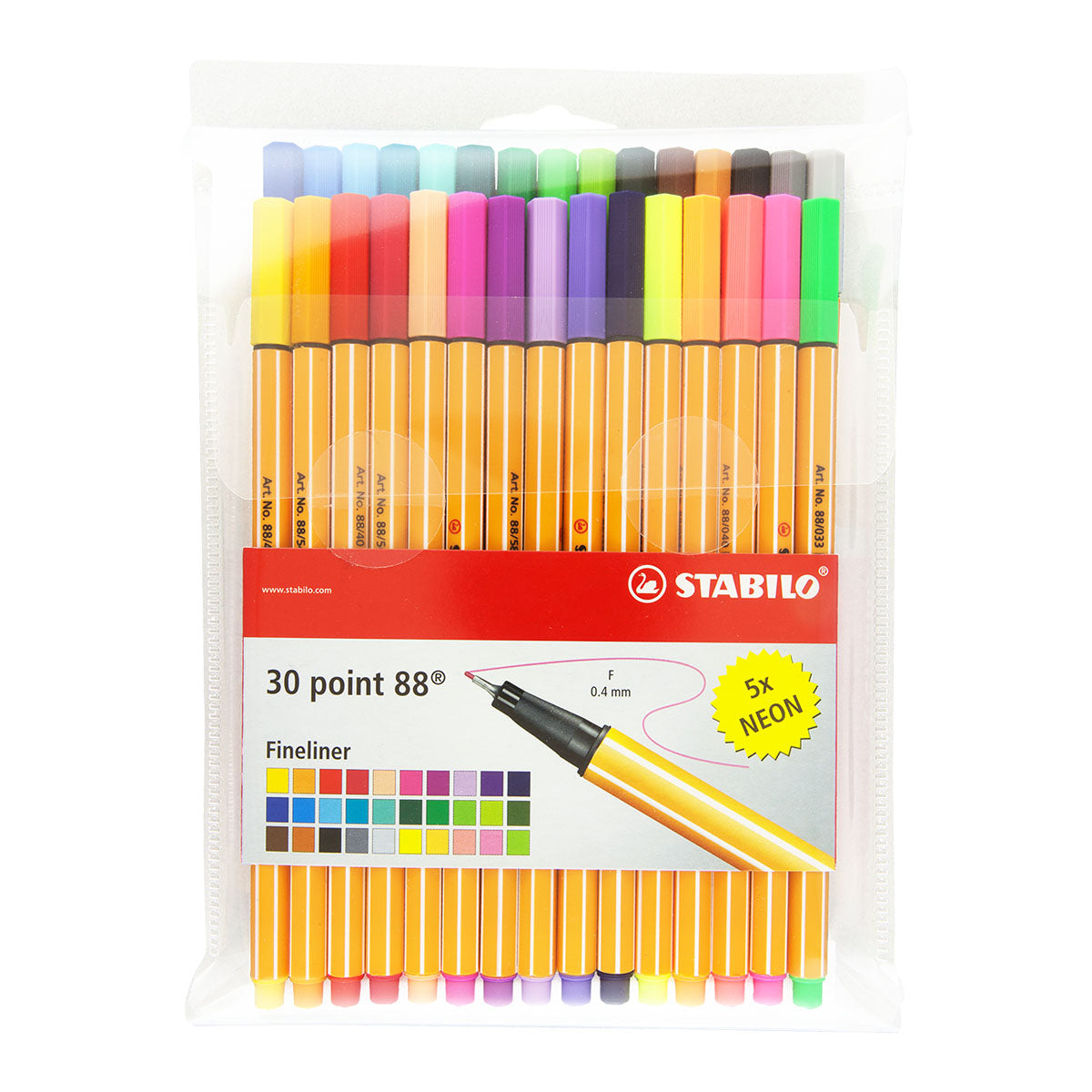 A pack of 30 Stabilo Point 88 Fineliners in different colours. The metal-reinforced tip traces lines that are as thin as 0.4 mm. Filled with water-based ink that has a short drying time. Scroll down this page to see which colours are included in this pack. We also sell Stabilo Point 88 Fineliners individually.