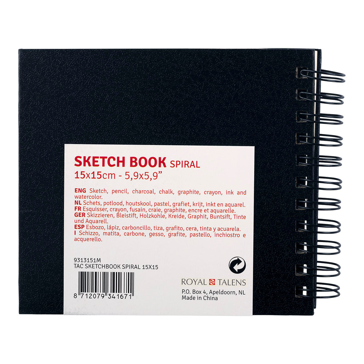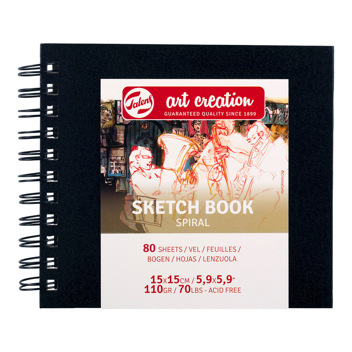 Talens Art Creation sketchbook with spiral binding, allowing you to lay the book completely flat or fold the pages around to the back. The 110 gsm acid-free paper is suitable for pencils, colored pencils, crayons, ink, or drawing charcoal. The sketchbook has a black hardcover and contains 80 sheets / 160 pages. This sketch books is in square format with the dimensions 15x15 cm.