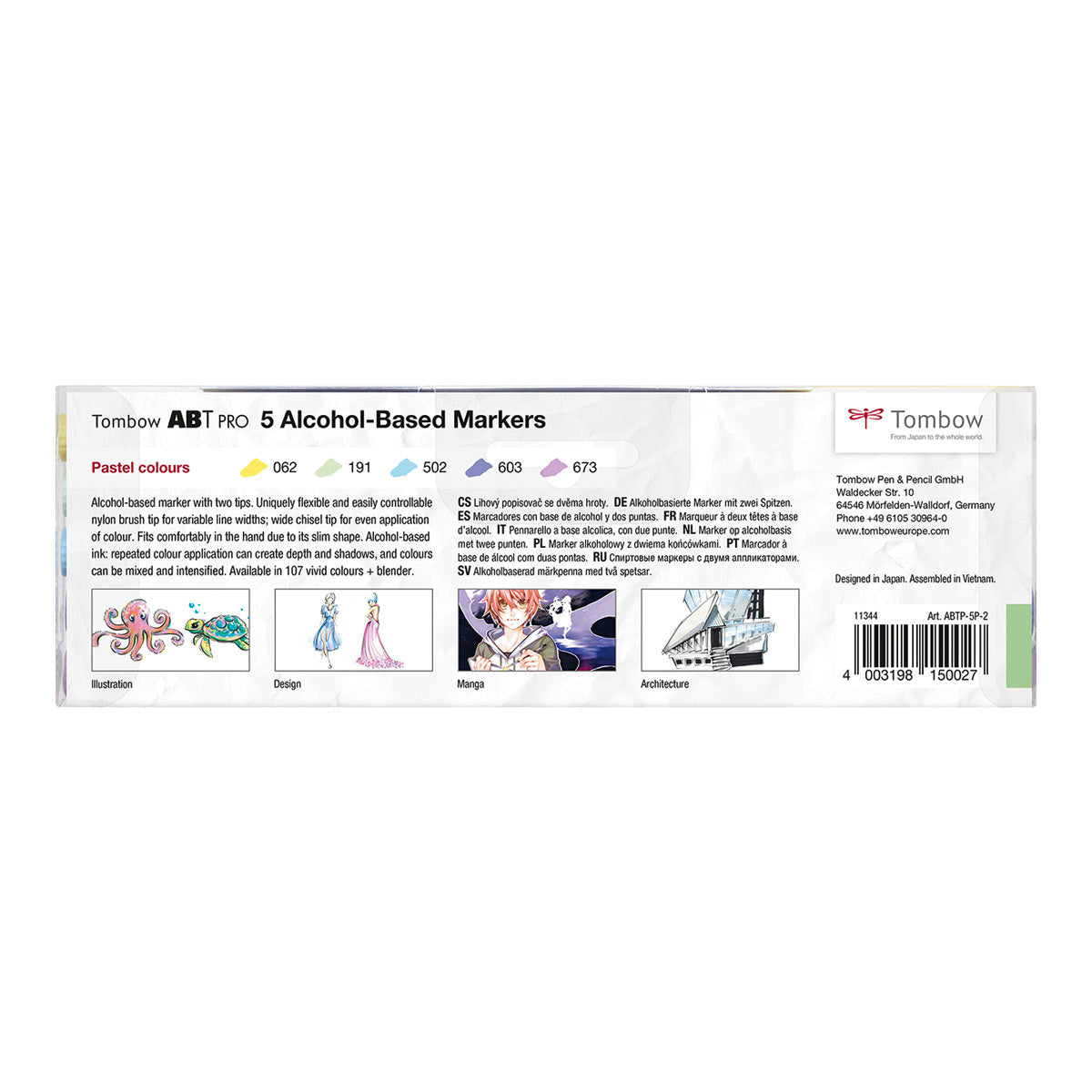 Pastel colours from the Tombow ABT PRO colour chart in a pack of 5. You can see which colours are included in the image gallery or further down on this page. The pens resemble Copic And Stylefile’s brush pens with a soft brush tip in one end and a broad chisel tip on the other end. Perfect for graffiti sketches, manga drawings, tattoos or regular illustrations. We also sell Tombow ABT PRO Dual Brush separately.
