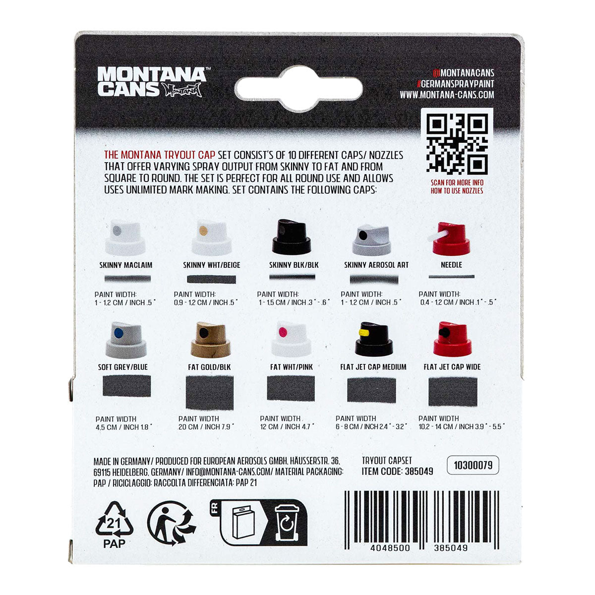 Oavsett om du arbetar med Montana GOLD, Montana BLACK eller Montana WHITE, finns det något för alla i detta set. Sortimentet inkluderar caps som Needle Cap, Outline Cap, Fat Cap och fler, vilket låter dig testa ett brett urval av tekniker från detaljerade linjer till bred täckning.
